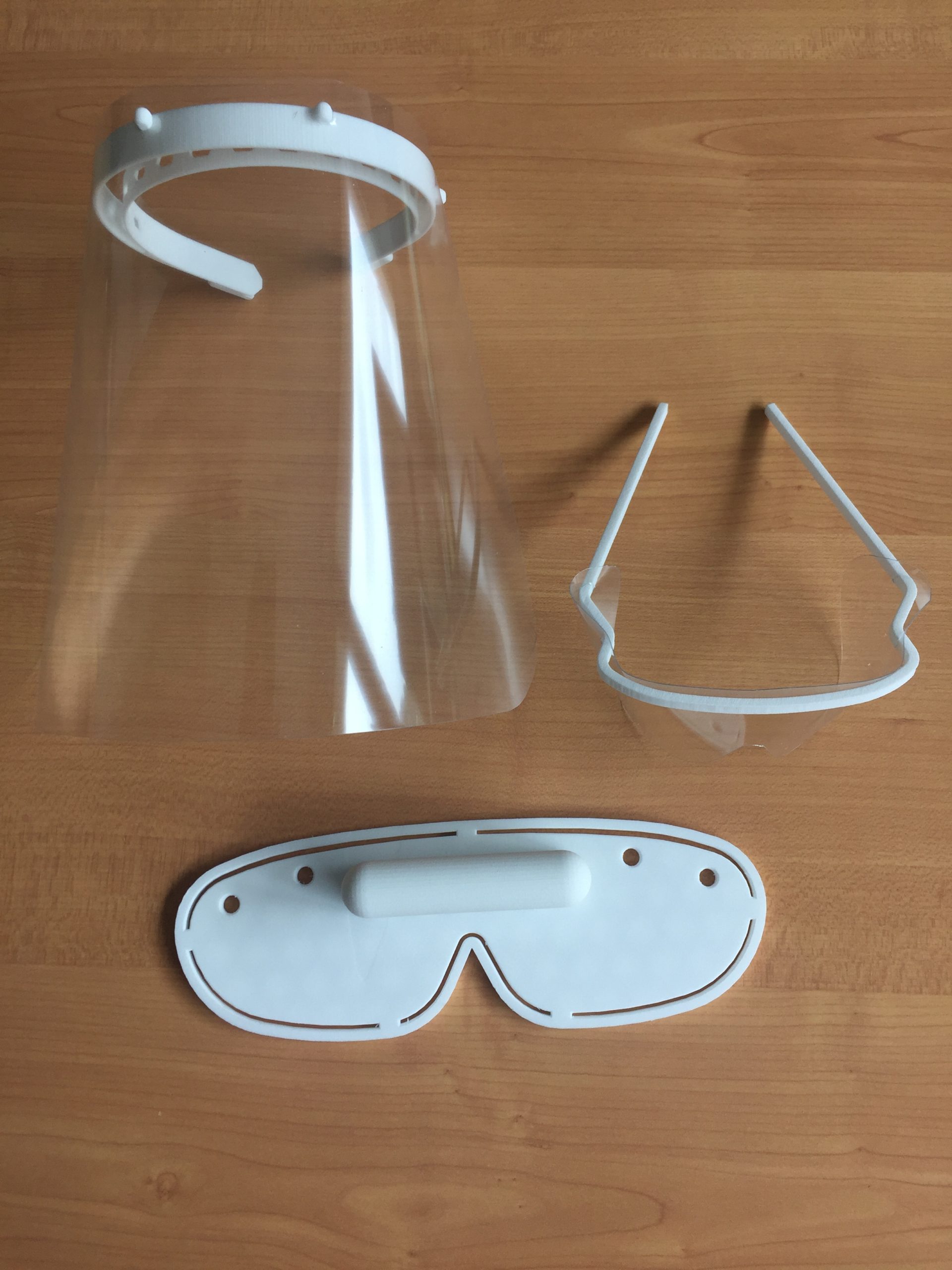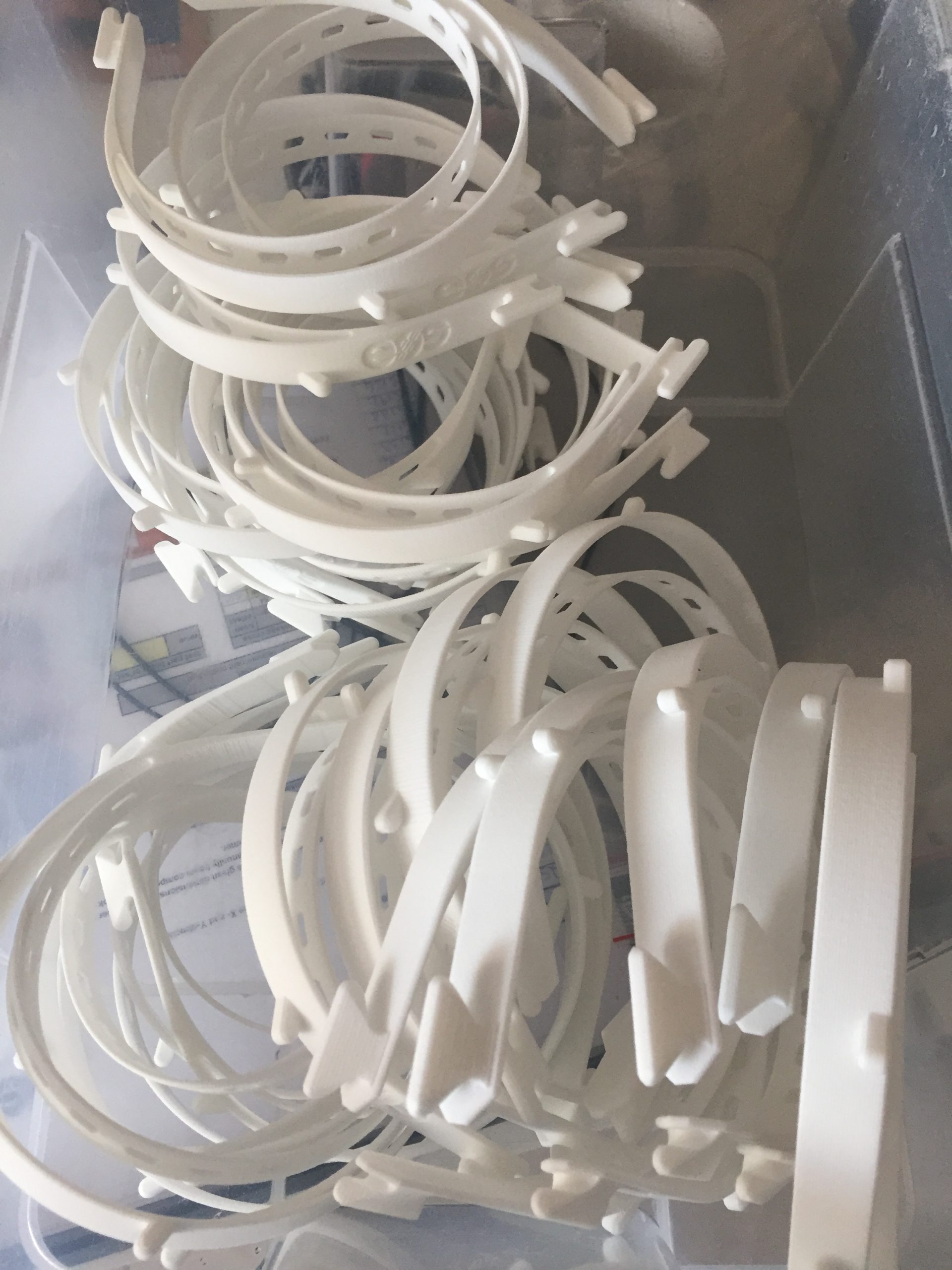 Tous nos partenaires se mobilisent pour fournir la matière première : EOS, fabricant d’imprimantes 3D additives, nous apporte 100 kg de matière première et Bureau Vallée nous donne des films plastiques. Nous imprimons des armatures blanches pour porter des lunettes de protection, puis nous découpons les protections dans du film transparent de papeterie.