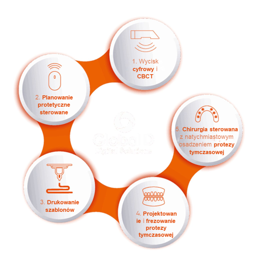 Protokół OLYMP opiera się na szablonach wieloetapowych i w pełni cyfrowym obiegu pracy. Umożliwia on natychmiastowe leczenie pacjentów z całkowitym lub częściowym bezzębiem, przy tymczasowym zachowaniu 3 zębów (jeśli przypadek na to pozwala) w celu stabilizacji szablonu.