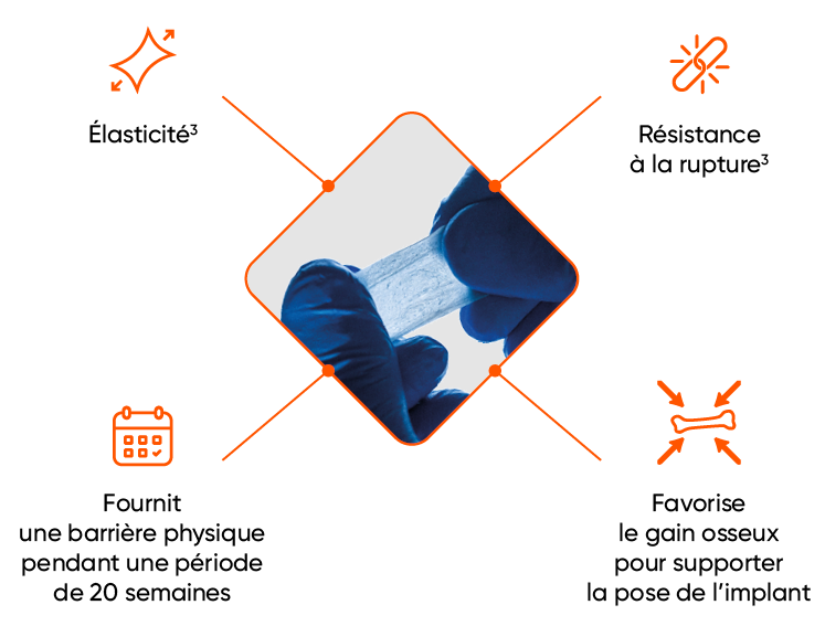 Grâce à son délai de résorption lent, durant une période de 20 semaines1,2, la membrane BIOBank Cover® fournit un effet barrière contre l’interposition des tissus mous dans l’espace créé dans le cadre des protocoles de régénération osseuse guidée. Le réseau fibreux de la membrane fournit une stabilité mécanique et prévient la migration du matériau osseux de greffe.